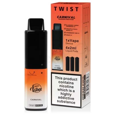 The Carnival Happy Vibes Twist 2400 disposable vape is an ideal choice for anyone looking for a disposable vape that lasts longer. It comes with four prefilled cartridges, each filled with 2ml of 20mg nic salt e-liquid, and a unique twist-top design to switch between them. Once all four cartridges run out, the device can simply be replaced. This allows each disposable vape to last for up to 2400 puffs.